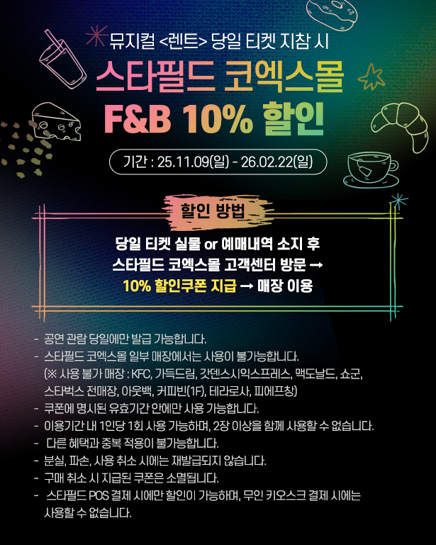뮤지컬 <렌트> 당일 티켓 지참 시 스타필드 코엑스몰 F&B 10% 할인 혜택!